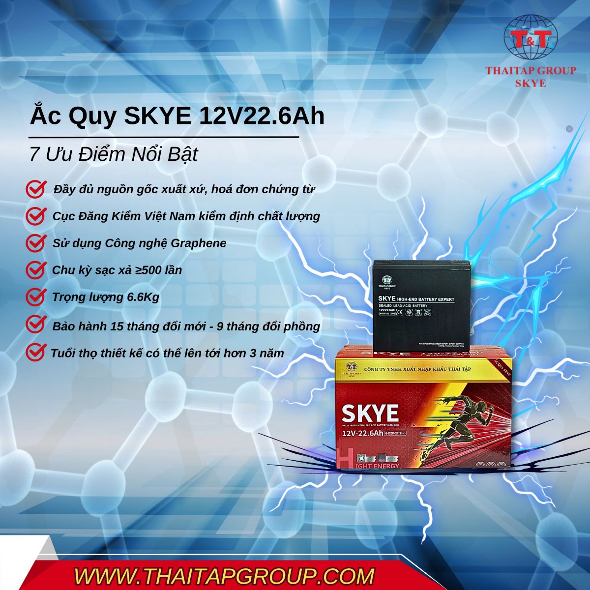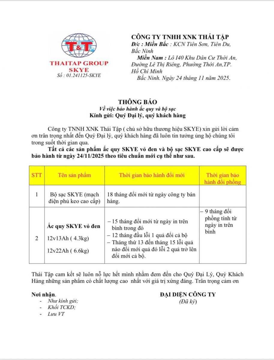 Công ty TNHH Xuất Nhập Khẩu Thái Tập xin trân trọng thông báo đến Quý Đại lý và Quý Khách hàng về việc áp dụng chính sách bảo hành mới cho sản phẩm Ắc Quy SKYE 12V22.6Ah và Ắc Quy SKYE 12V13.3Ah.