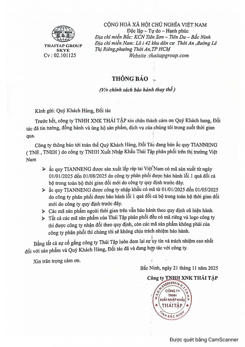 +) Ắc quy TIANNENG được công ty nhập khẩu có mã từ 01/01/2025 đến 01/05/2025 do công ty phân phối được bảo hành lỗi 1 quả đổi cả bộ trong toàn bộ thời gian đổi mới do công ty quy định trước đây.